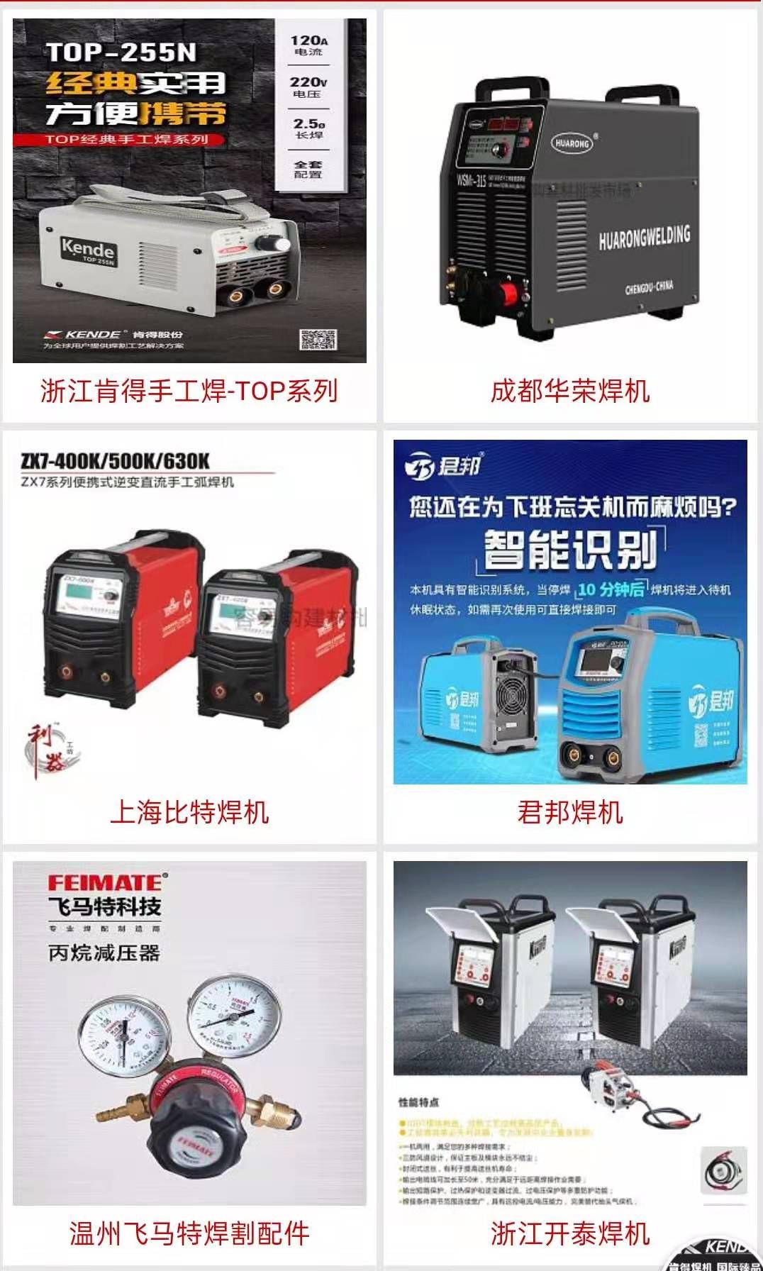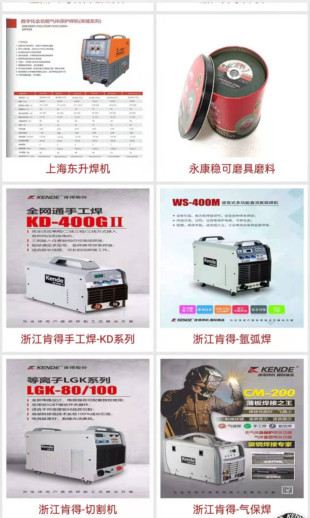 主营品牌:上海东升 上海比特 浙江肯得,浙江开泰 佛山君邦 深圳麦格米特 无锡汉神 成都华荣 成都熊谷 温州飞马特焊割配件,宁波振新仪表 主营项目:肯得焊机,君邦焊机,东升焊机,埋弧焊系列,开泰焊机,飞马特焊割配件,华荣焊机,脉冲焊系列,气保焊系列,切割机系列,手工焊系列,氩弧焊系列,磨具磨料,稳可磨片,焊枪,焊枪配件,射吸式割炬,快速接头系列,气体减压器系列,等离子割枪及配件,电焊条、焊丝、等离子割咀。枪带,焊机类:气保焊机,宽电压电焊机,氩弧焊机,等离子切割机,数控切割机。焊条类:碳钢,低合金钢,不锈钢,堆焊,耐热。焊丝类:二氧化碳保护焊机,自动埋弧,钨极氩弧、配件类:二氧化碳焊机配件,等离子切割配件,氩弧焊配件。定做高端防冻等离子割枪氩弧焊枪等焊接设备配件,射射吸式,日本式,等压式,焊割炬、焊割咀;塑料焊枪;各种异型加长炬;气压减压器;回火防止器; 保护咀、保护嘴、二氧化碳系列、导电嘴、喷嘴、枪头、一般压力表:耐震、防腐、电接点、双金属温度计及各种特殊压力表;氧气带、乙炔带;半自动切割机;各种电焊钳、电焊帽、等离子枪、氩弧焊、二氧化碳气体保护焊枪及各种配件、电焊机、二保焊机、数控等离子机、各种气瓶吸式、喷火炬、喷火枪、减压阀、中压阀、钨钳、加热炬、塑料焊枪,气体减压器、二氧化碳减压器、焊咀防堵剂、钨电极、回火防止器,压力表,氧气管 、乙炔管、半自动切割机、磁力管道切割机、电焊钳、电焊帽,便携式数控小蜜蜂 1530、1540、1550、1560. 不锈钢焊丝 有色焊材:铜及铜合金焊接材料、铸铁补焊、钴基合金堆焊、铝及铝合金焊接、镍及镍合金焊接、各种钎焊及热喷涂材料。特种焊材:各种堆焊、耐磨、耐热焊条、各种耐热药芯焊丝等。不锈钢焊材:022、102、302、等配用母材。机器类:自动焊接设备 焊接辅助机具、操作机、滚轮架、变位机、回转平台、焊接专机。电焊机、数控切割设备、气保焊、埋弧焊、氩弧焊、手工焊、MIG焊等!电线电缆 、电动工具、 气泵发电机、 公司相册