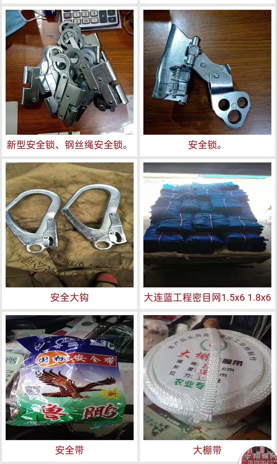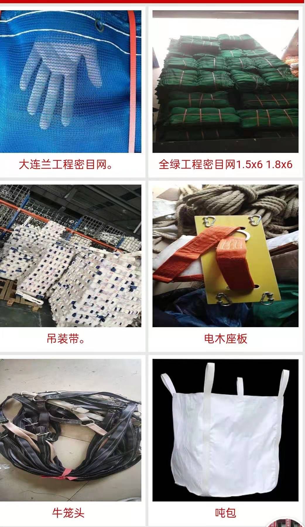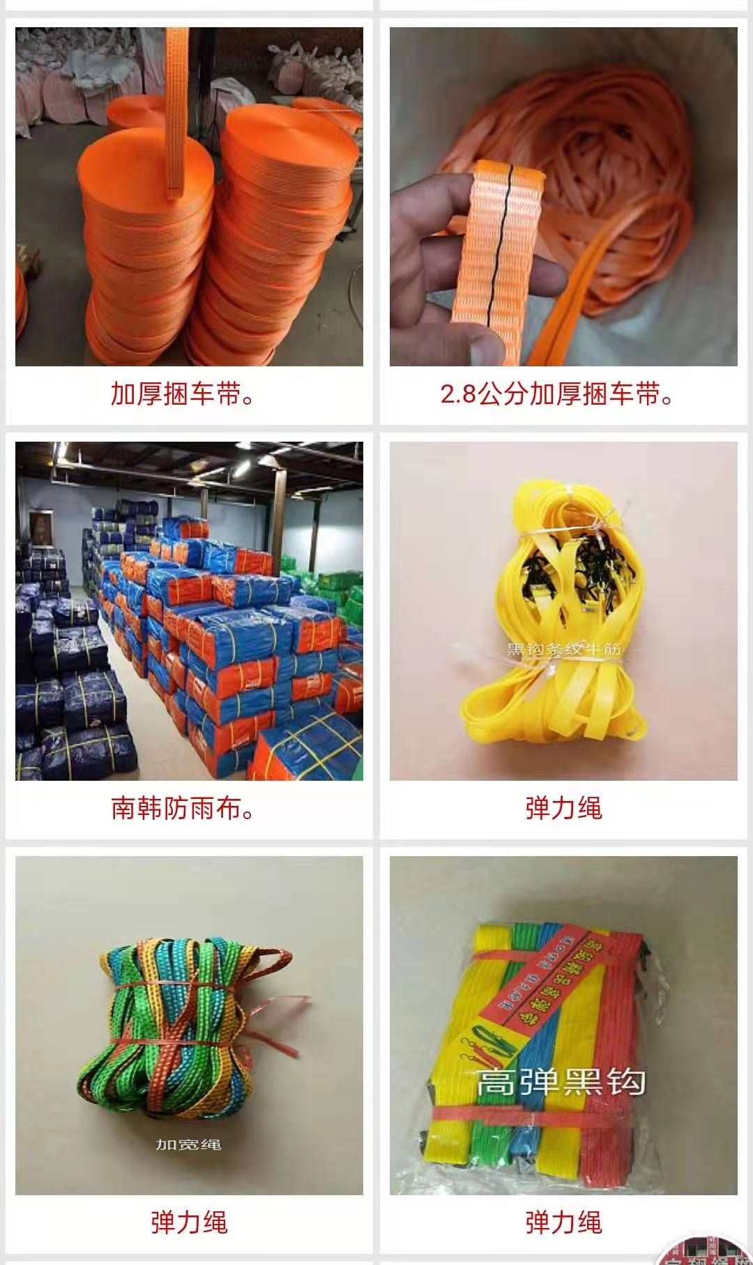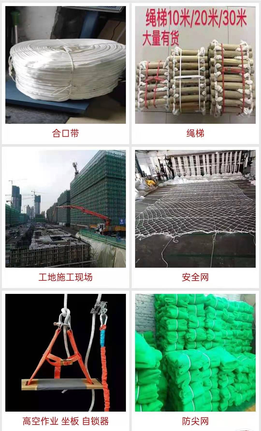 主营品牌: 主营项目:黄绳,海绳,白丝绳,棕绳,麻绳,地毯丝绳,彩绳,白尼龙绳,丙纶绳,百米绳,吊大棚绳,牛纲绳,尼龙工程线,棉线,鱼线,插秧线,麻袋绳,封口线,大棚带,合口带,安全带,封车网,大棚网,火车网,草球,麻球,安全网,绳子,牛笼头,全绿工程密目网、安全大钩、安全锁、钢丝绳安全锁、弹力绳、南韩防雨布、捆车带、吨包、牛笼头、牛龙头、电木座板、吊装带