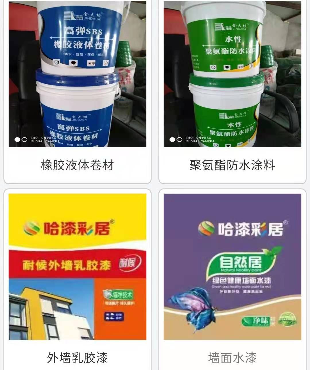 主营项目:乳胶漆,内墙漆,外墙漆,水性漆,SBS液体卷材,聚氨酯防水涂料,真石漆,外墙乳胶漆,净味漆,环保漆,封闭地漆,墙面漆,水包水 ,水包砂 ,质感漆 ,腻子粉 抗裂腻子粉,墙泥,苯板胶,墙固,地固,防水涂料,液体防水卷材等