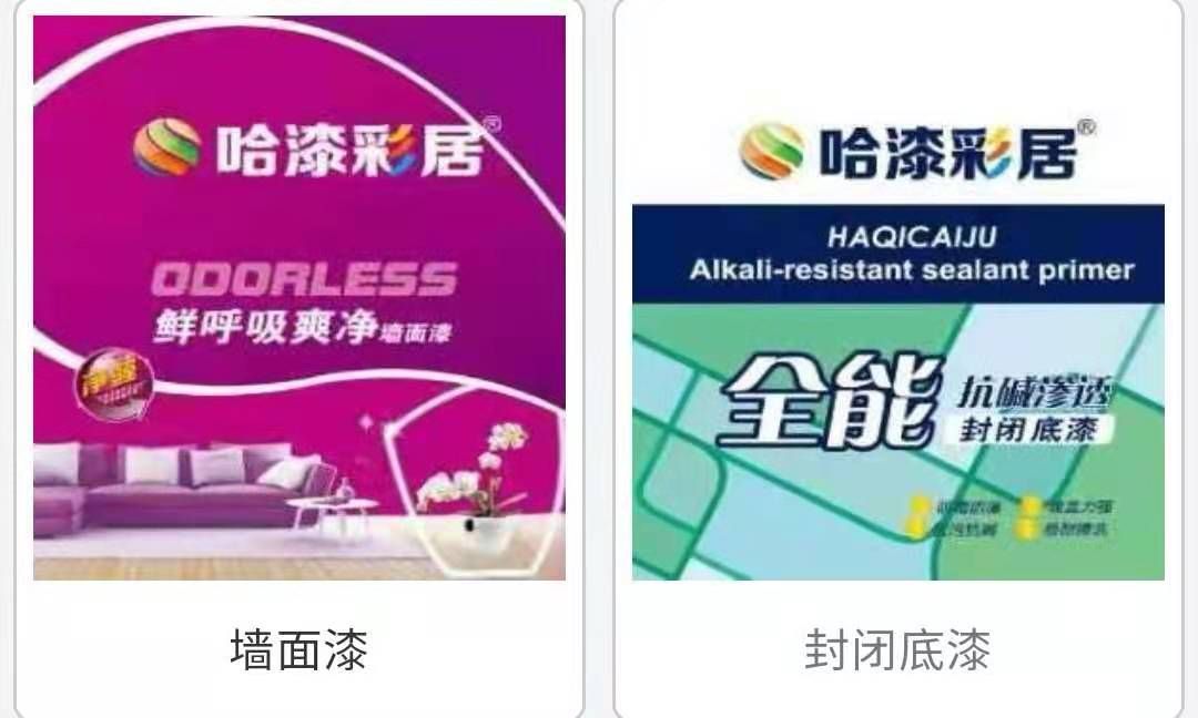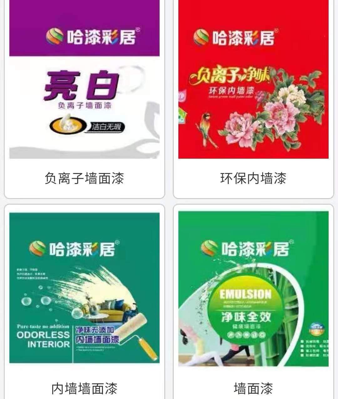 经营范围:主营品牌:厂家直销,哈漆彩居  主营项目:乳胶漆,内墙漆,外墙漆,水性漆,SBS液体卷材,聚氨酯防水涂料,真石漆,外墙乳胶漆,净味漆,环保漆,封闭地漆,墙面漆,水包水 ,水包砂 ,质感漆 ,腻子粉 抗裂腻子粉,墙泥,苯板胶,墙固,地固,防水涂料,液体防水卷材等